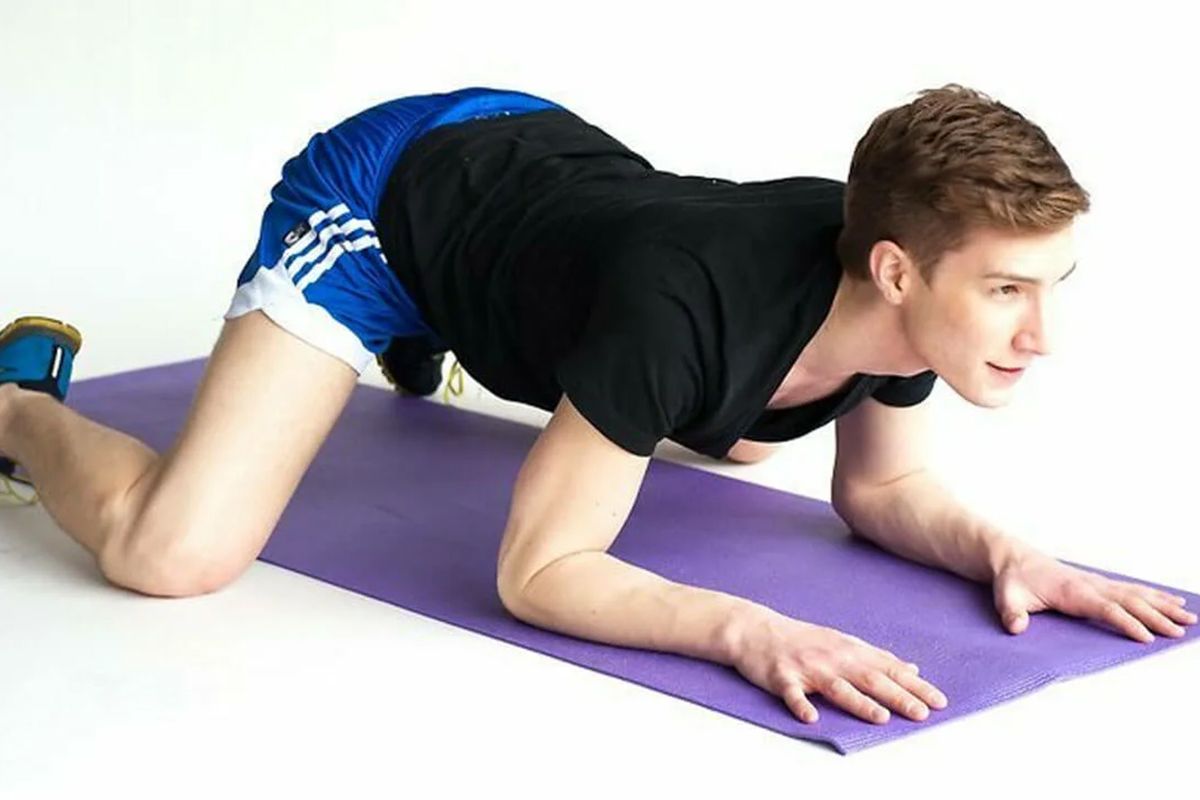 Встаньте на четвереньки и широко разведите колени. Стопы можно соединить, но это не обязательно. Опуститесь на предплечья и тянитесь грудью и животом к полу.
