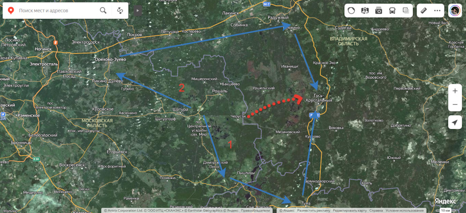 Периодически в интернете возникают вопросы «Можно ли проехать из посёлка Черусти в Гусь-Хрустальный?». Если взглянуть на карту, то станет понятно почему люди хотят добраться из условной Шатуры в соседнюю область более коротким путём: