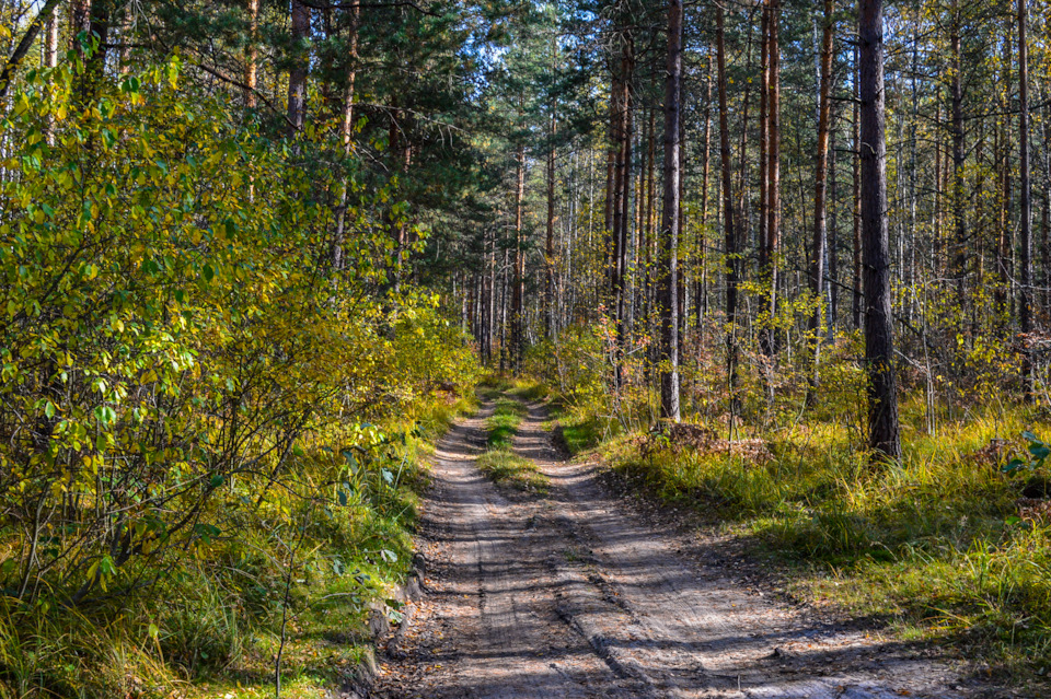 В посёлке Болотский ориентируемся по дороге, усыпанной известковой пылью. Доезжаем до КПП, дальше не пускают. И по натоптанной лесной тропинке углубляемся налево в лес.