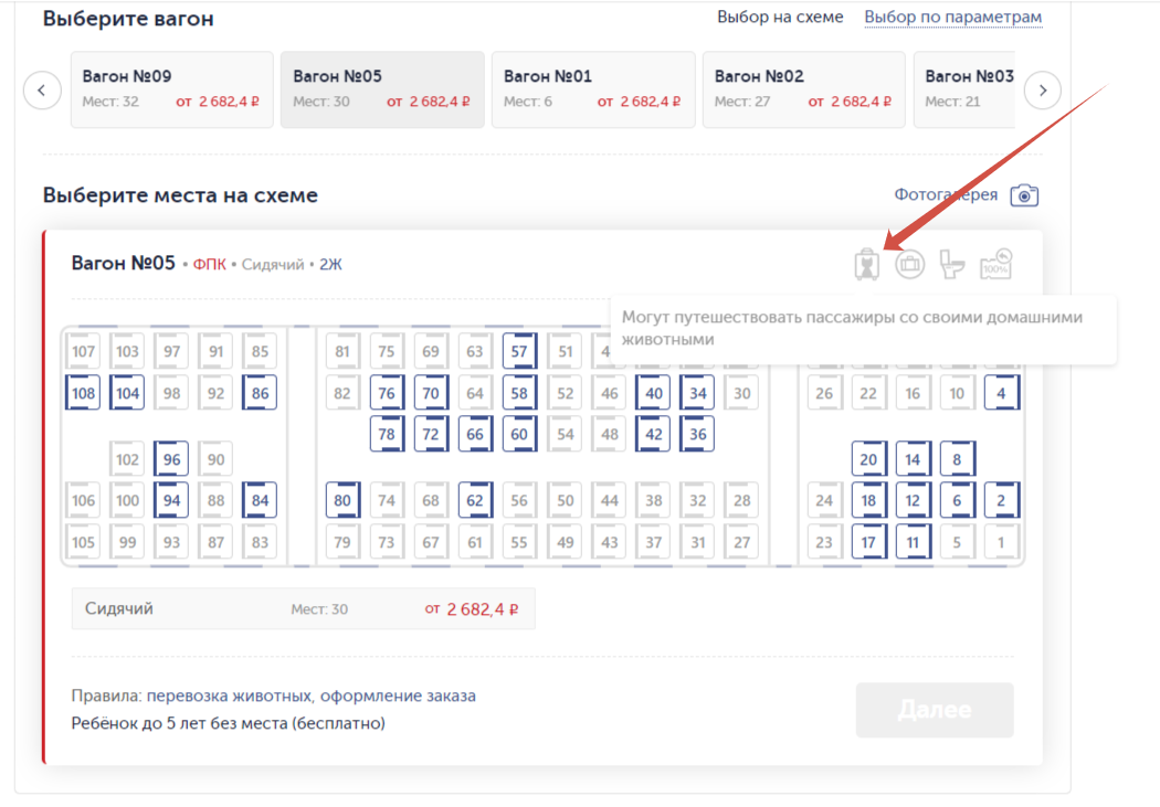 При выборе билета ориентируйтесь на значок с изображением животного. Если значка нет — провоз животных в этом вагоне запрещён. Найти такой значок можно нажав на кнопку «О поезде».